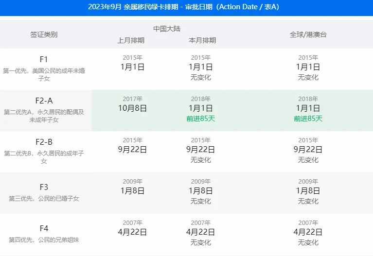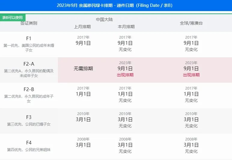 美国国务院签证办公室公布了2023年9月的签证公告(Visa Bulletin),关于职业移民和亲属移民排期表详情见以下表格。