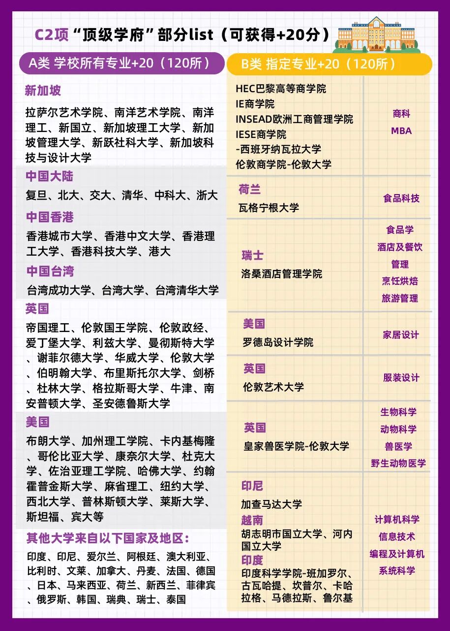 可获得20分的“顶级学府”包括: