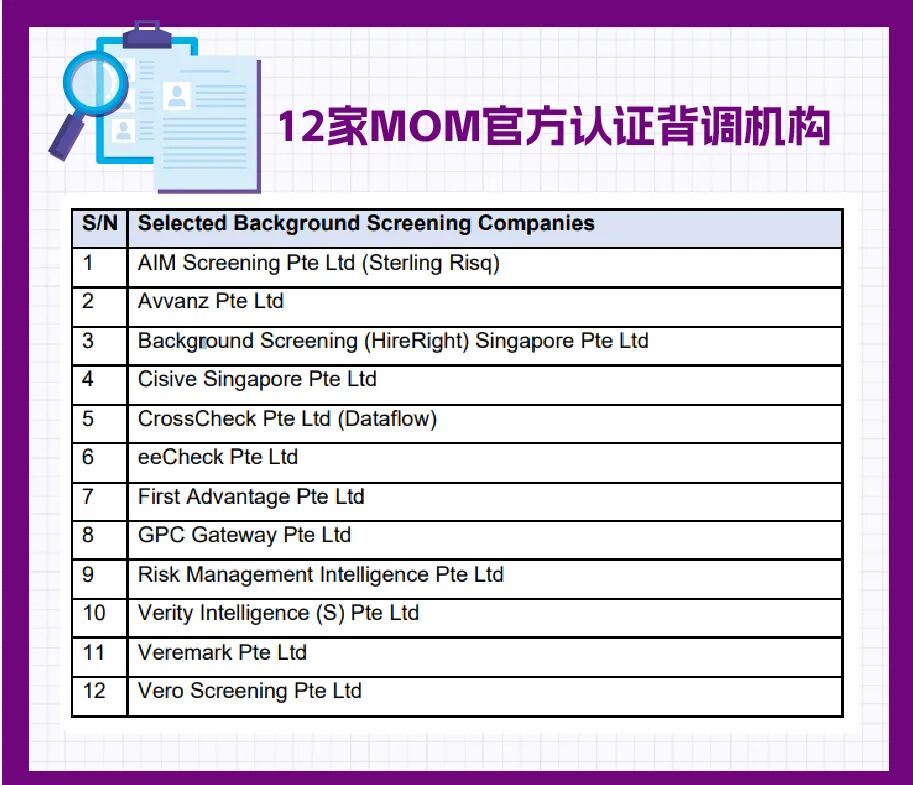 其中,MOM指定的12家认证背调机构包括: