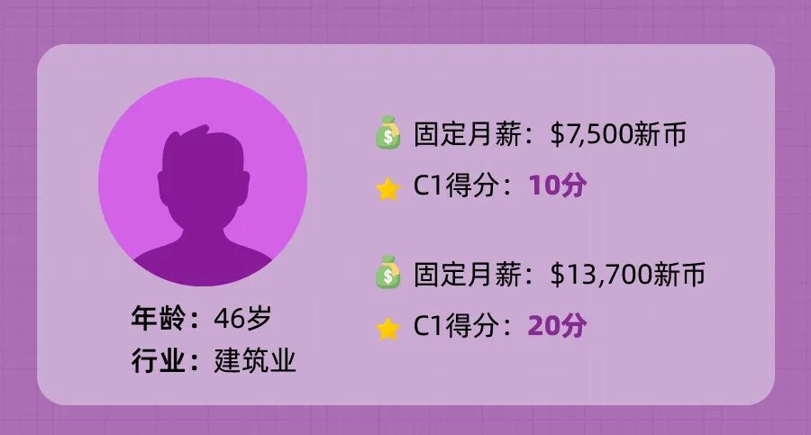 举个栗子:申请人从事建筑业,年龄46岁,根据MOM的统计数据,他的月收入达到$7,500新币(前65%)可以拿到10分,如果达到$13,700(前90%)则可以拿到20分,如果低于$7,500则C1项就无法得分了。
