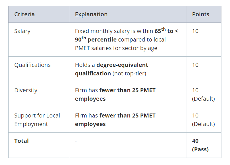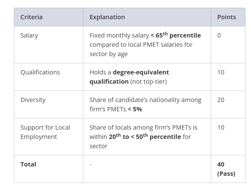C1薪资标准以竞次排序的方式打分,综合考察申请人的岗位,年龄,与新加坡本地同级别的PMET员工(P指专家Professionals、M指经理级Manager、E指管理层Executives、T指技术人员Technicians)根据其所在的百分位打分,如果工资达到前90%可获得20分,达到65%-90%可获得10分,低于65%则无法得分。