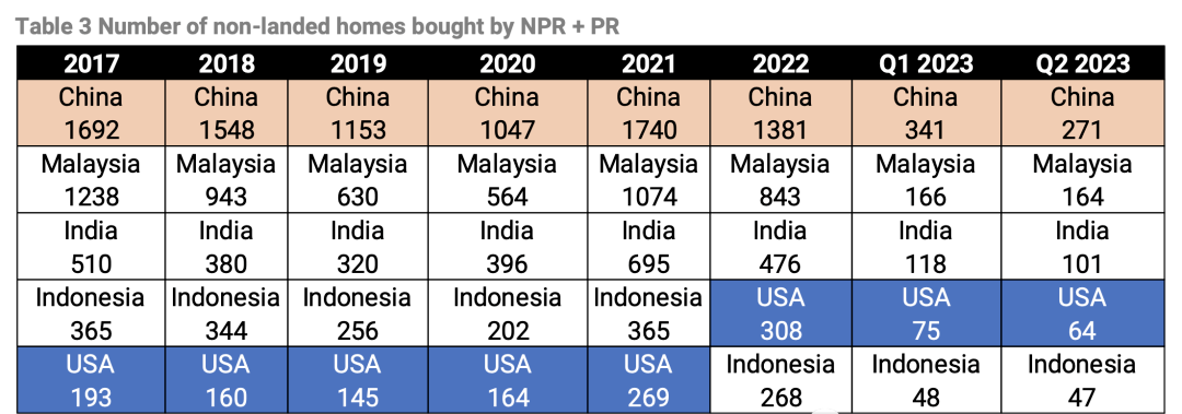 根据7月最新数据显示,美国非永久居民购买非落地住宅的比例从 2023 年第一季度的 23.8% 上升到 2023 年第二季度的 27.3%。相比之下,同期中国大陆非永久居民购买非落地住宅的比例从 41.1%下降到 24.9%。2023年第二季度,中国买家仅购入51套私宅单位,低于美国买家购入的56套私宅单位。落于后方的则是购入7套单位的印尼买家和4套单位的印度买家。