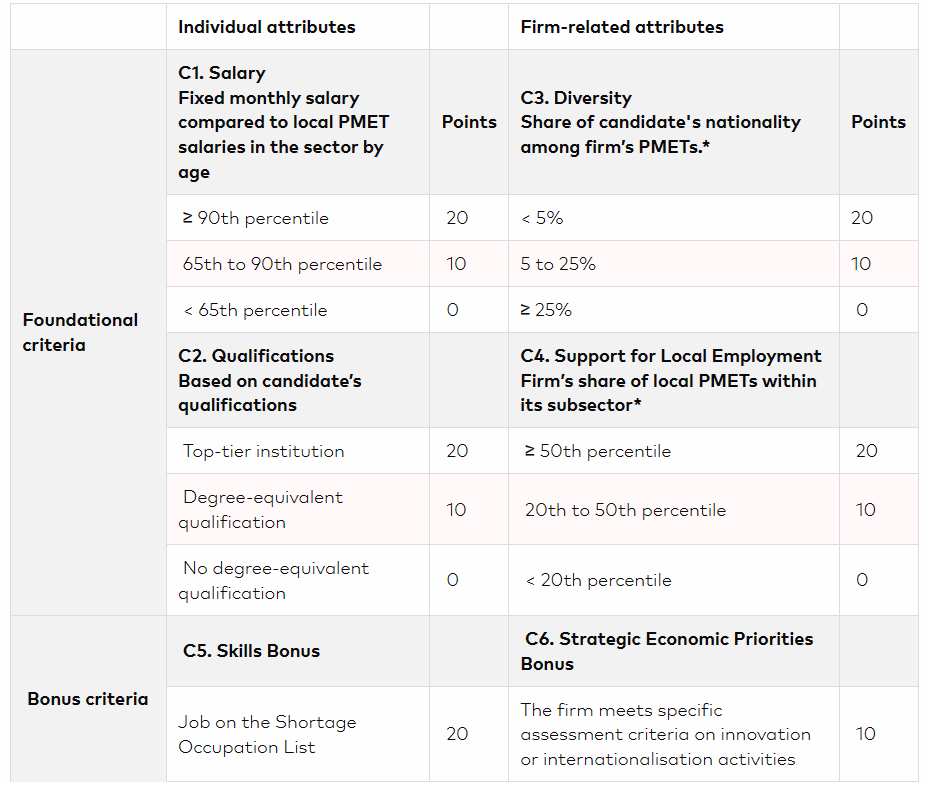 从2023年9月1日起,新加坡将启用基于积分的“互补性评估框架”即COMPASS打分制度,以评估申请人获得新加坡就业准证(EP)的资格。申请人必须通过框架的四个项目,薪水、学历、企业员工多样化、支持聘用本地人取得至少40分,以符合申请资格。