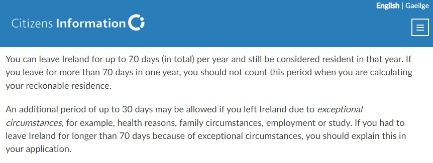原规定:申请人每年可以在爱尔兰境外停留最多42天,且仍满足居住要求。