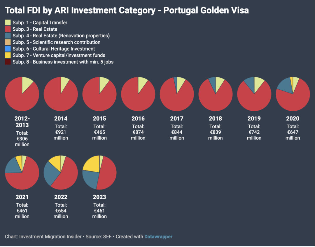 葡萄牙黄金签证各投资选项在外国直接投资中的份额