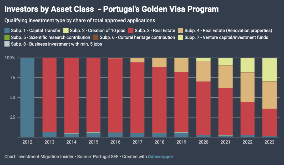 2023年,葡萄牙投资人选择的主要投资方式分为三个阵营:常规的50万欧元房产投资、35万欧元翻新房产投资、以及50万欧元的基金投资。