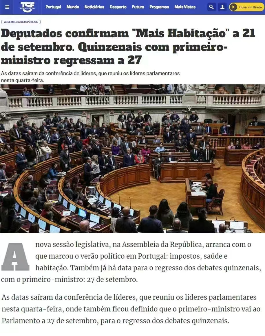 葡萄牙共和国议会9月6日举行领导人会议,决定议会将于9月21日审查共和国总统否决的有关住房措施的法令,总统将于9月27日出席议会进行讨论,预计变政安全期至十月中旬!