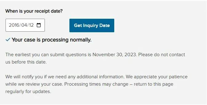 移民局只允许对超出上述处理时间的案件进行咨询。申请人可以通过输入自己的优先日期,查询自己是否可以联系移民局,进行案件进度的咨询。