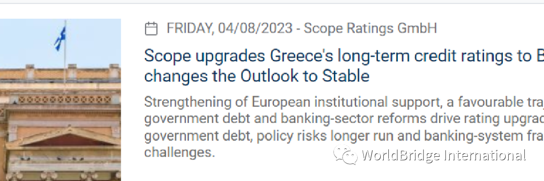 今年8月,欧洲领先的信用评级提供商Scope Ratings将希腊的评级提升至投资级。