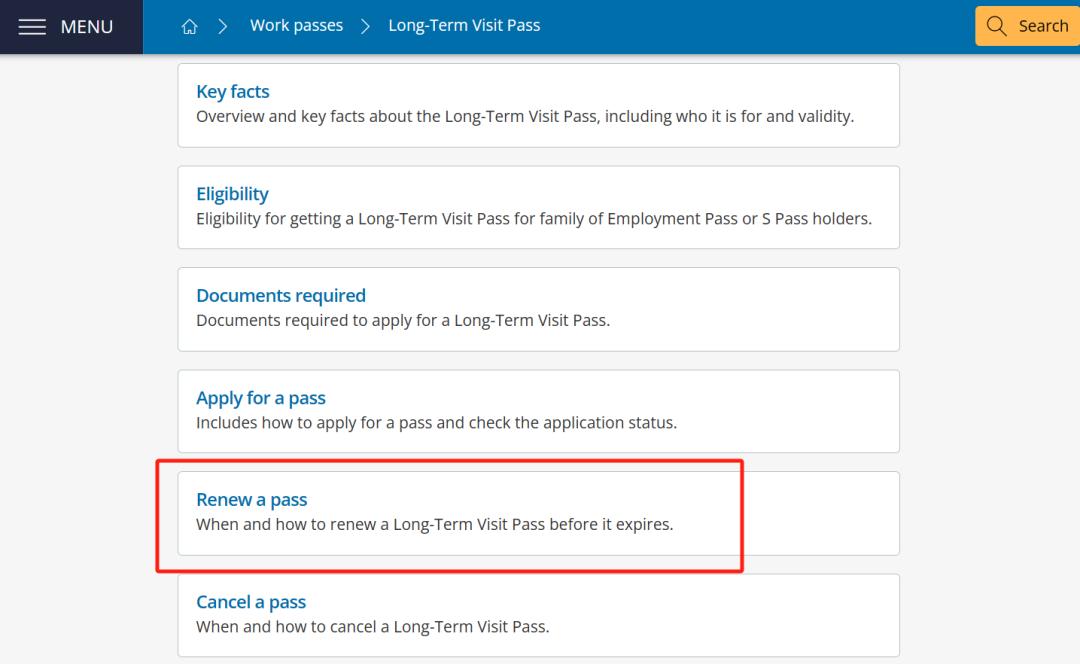 在"Work passes"下方选择您所持有的工作准证名称。以下将通过"Long-Term Visit Pass"(长期探访准证)为例说明:
