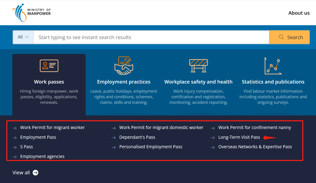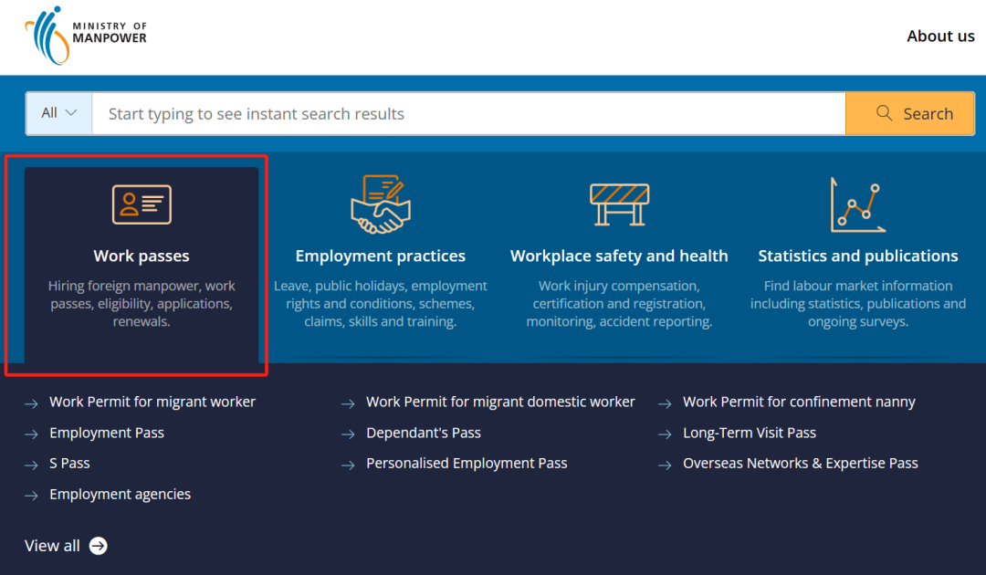 进入新加坡人力部官网首页后,点击"Work passes"(工作准证):