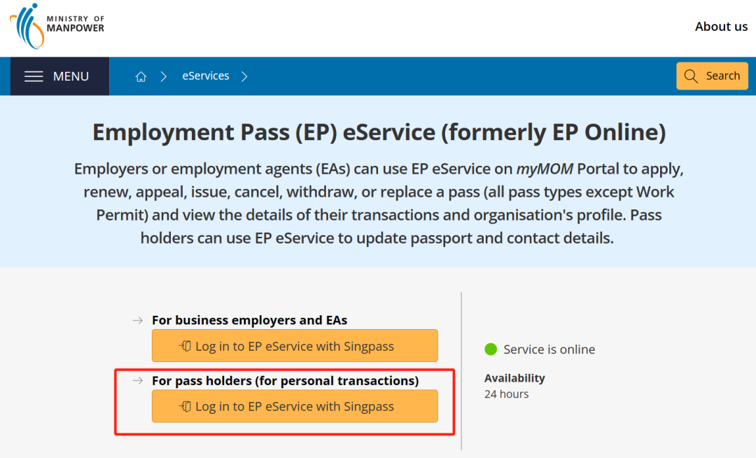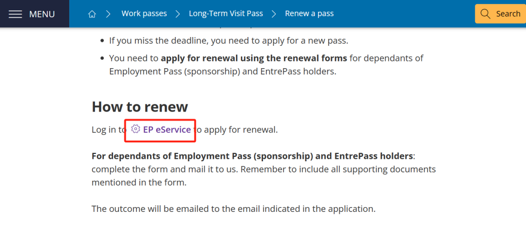 进入"Renew a pass"后,下滑选择"EP eService"选项点击进入。