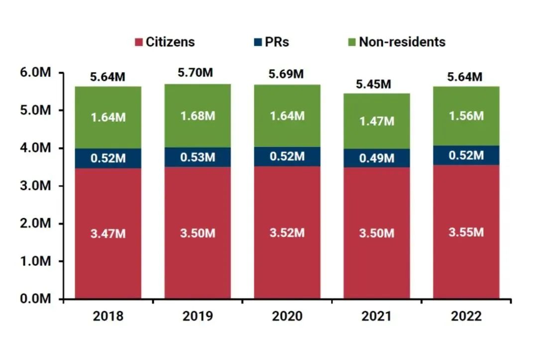 据2023人口简报,今年生活在新加坡的非居民人数相比于去年的156.3万人,增加了13.1%达20万人,总数涨到了176.8万。