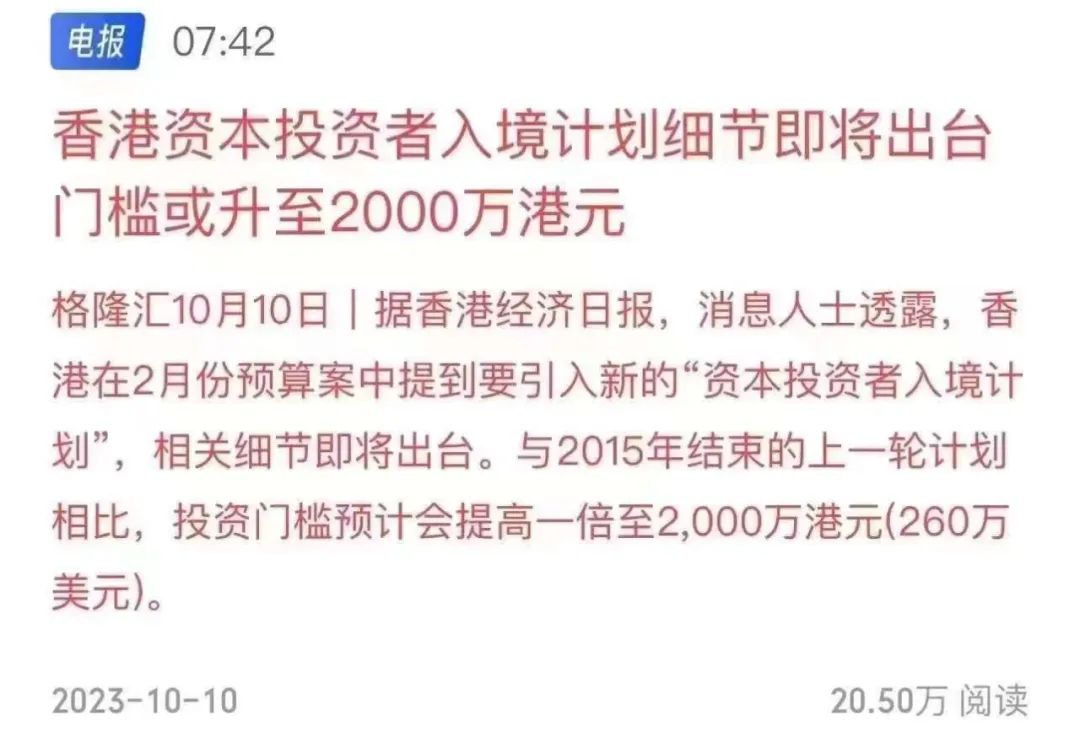 2023年2月22日,香港财政司司长陈茂波在公布“财政预算案”时表示:为进一步丰富人才库及吸引更多新资金落户香港,香港会引入新的「资本投资者入境计划」。