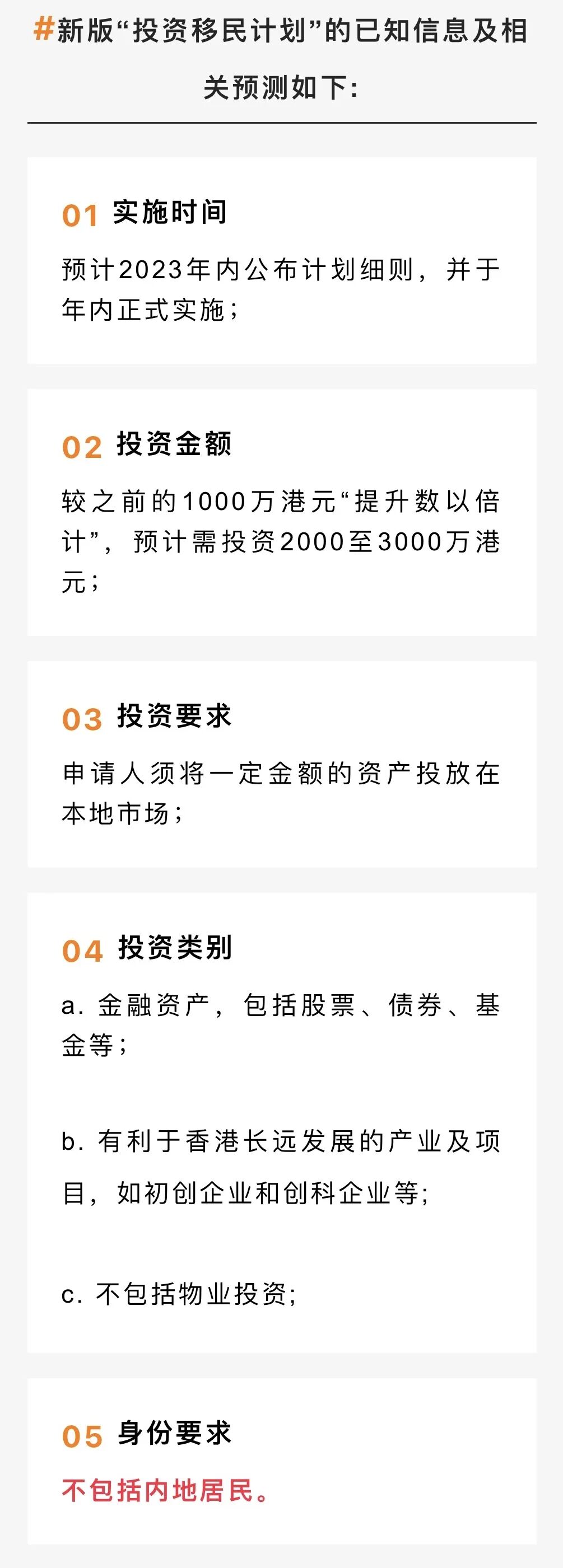 即通过内地身份+国外永居这样的方式,就能申请香港投资移民计划。所以,新版投资移民计划不排除参考旧版的相关政策,内地居民不妨提前了解一下。