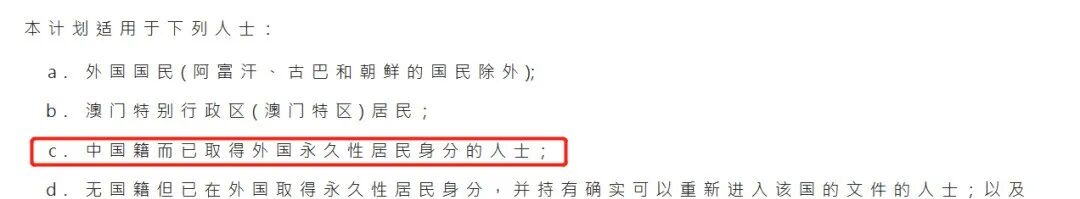 因为其计划的适用范围中包括:中国籍而已取得国外永久性居民身份的人士。