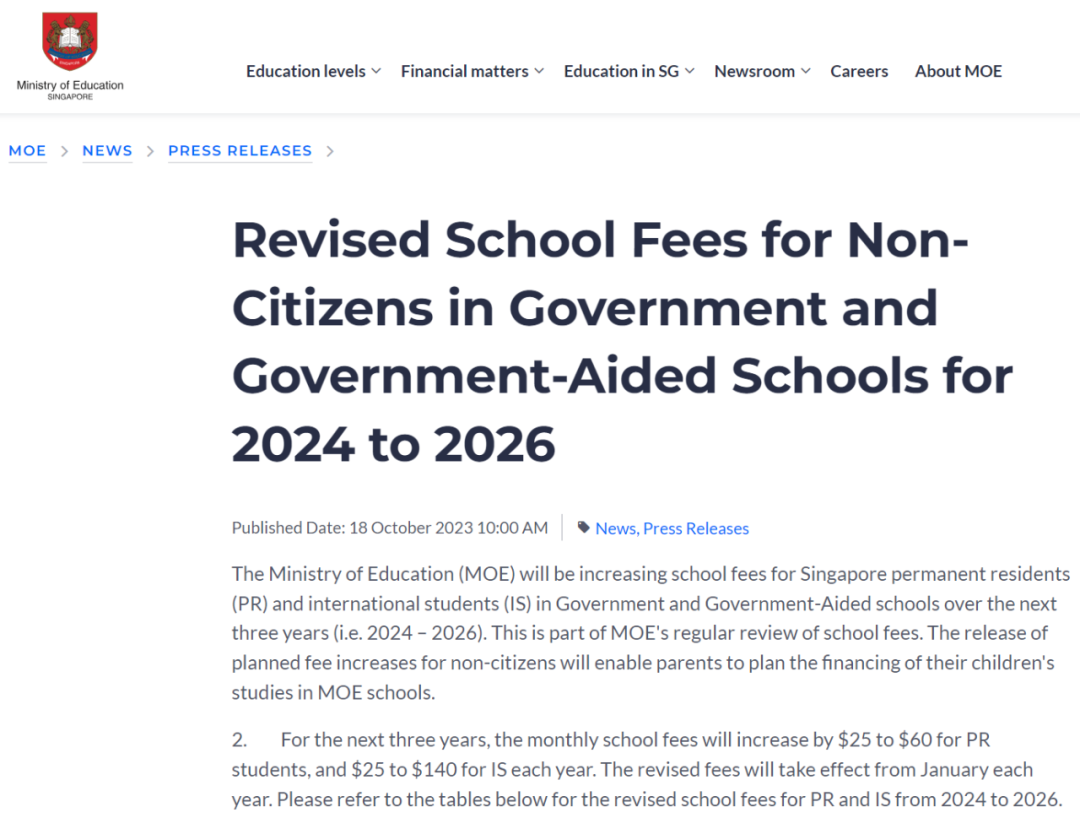 新加坡教育部 (MOE) 将在2024年至2026年每年提高政府和政府资助学校的非新加坡公民即永久居民 (PR) 和国际学生 (IS) 的学费。