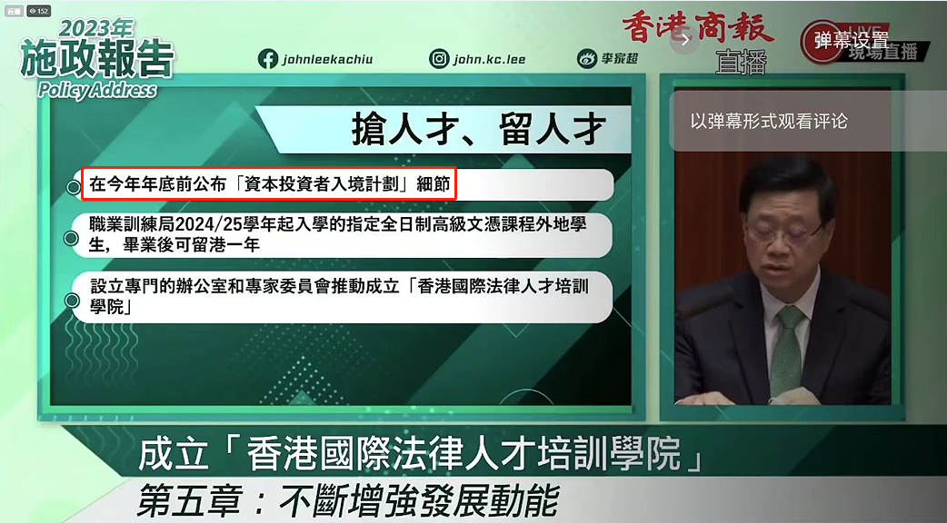 4、落实“资本投资者入境计划” —— 在香港投资于股票、基金、债券等资产(房地产除外)3,000万元或以上的合资格投资者,可以透过计划申请来港,以增强香港资产及财富管理、金融及相关专业服务界别的发展优势,细节今年内公布;及
