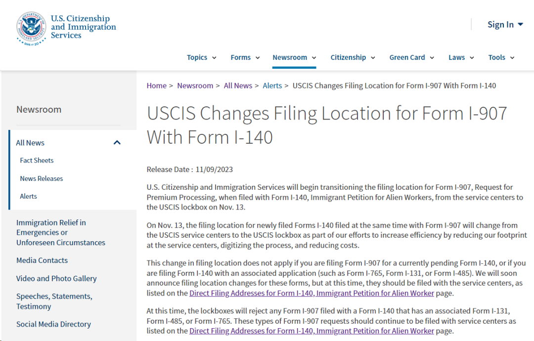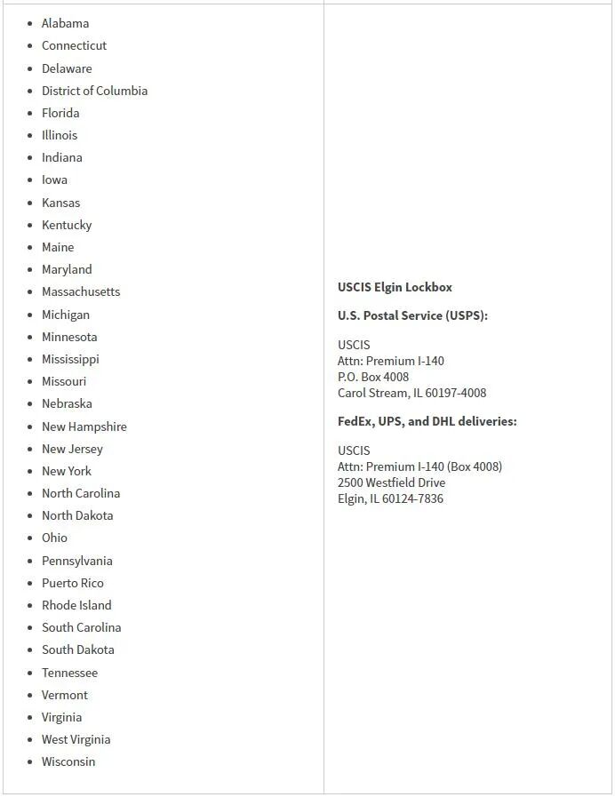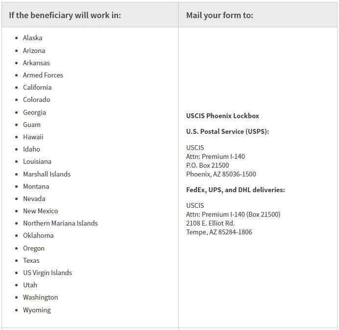 从2023年11月13日起,同时递交的I-907和新I-140的送件地址如下: