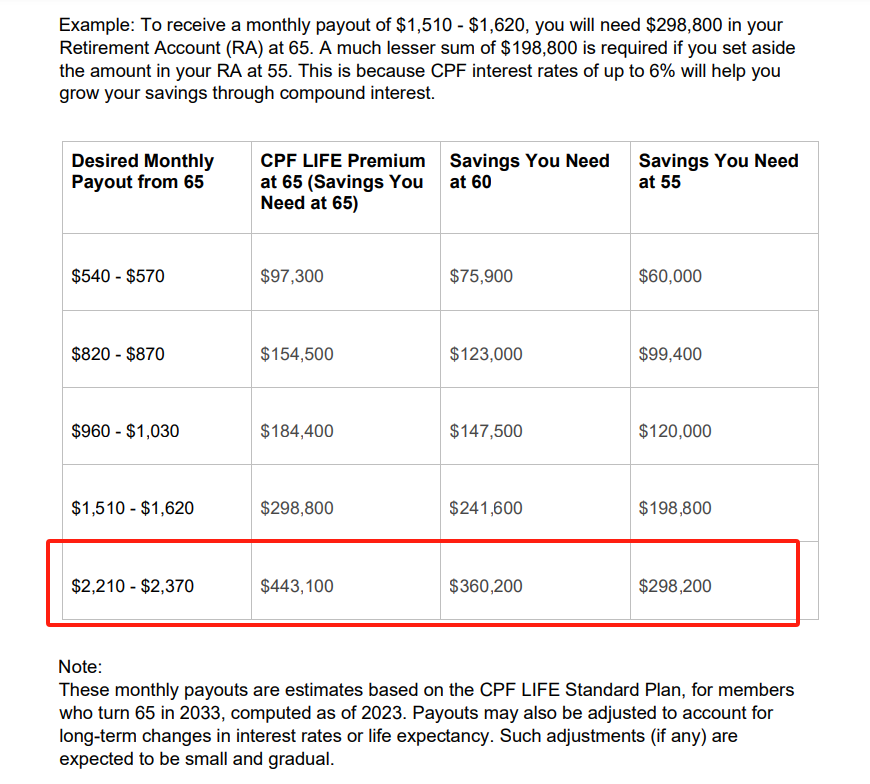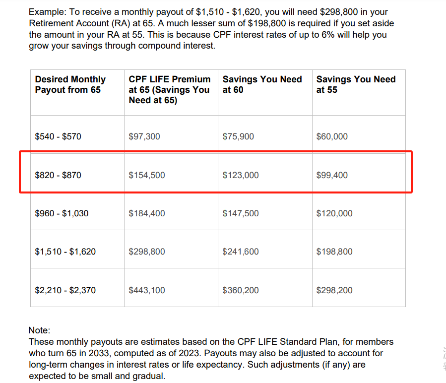 在CPF LIFE项目下,如果是年满55岁,选择保留99,400新币的基本存款(Basic Retirement Sum),在65岁后每月能领取820 - 870新元。