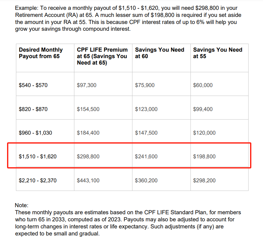 如果选择保留198,800新币的全额存款(Full Retirement Sum),65岁后每月领取1,510 - 1,620新元。
