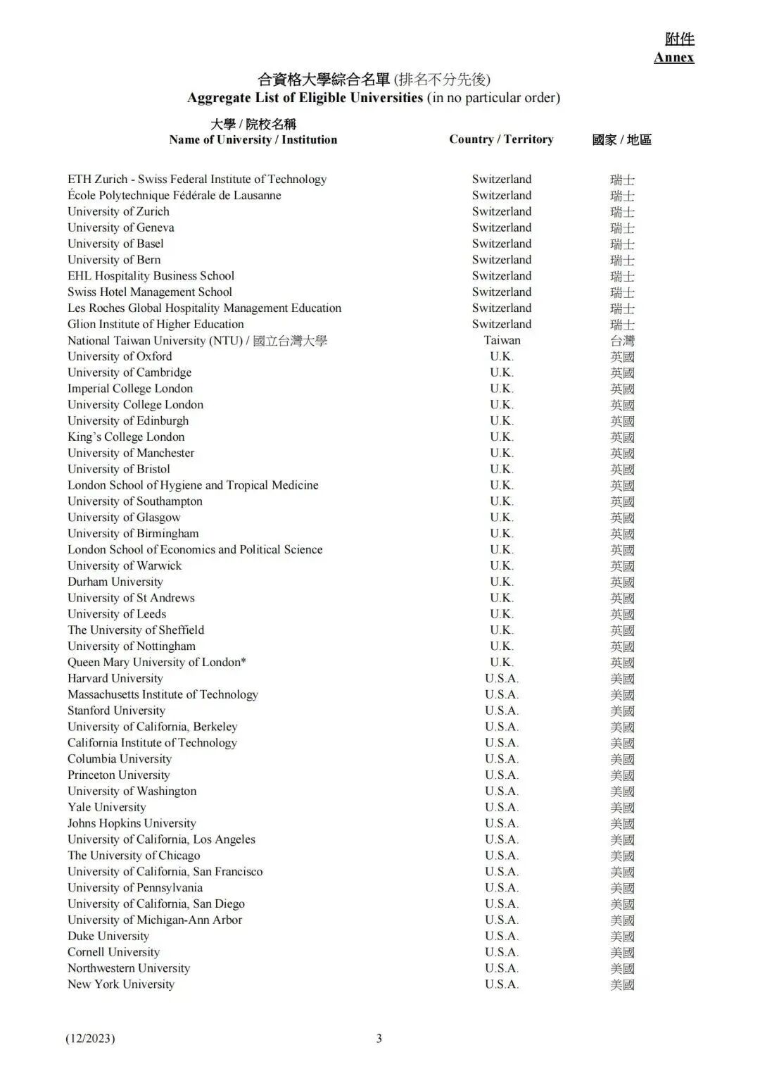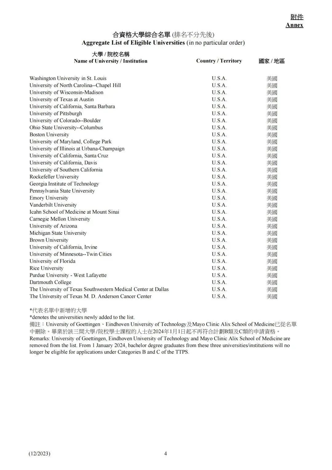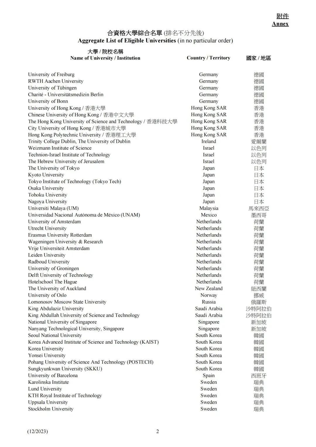 好消息,继10月底香港施政报告发布之后,短短两月,港府再次更新《合资格大学综合名单》,新增4所,删除3所!更新后的名单涵盖185间合资格大学及院校,榜单于2024年1月1日生效!