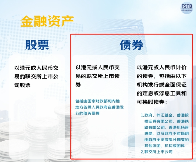 包括以港元定价的政府债券和企业债券,即可以选择由政府相关机构发行或保证的定息或浮息工具和可换股债券,或由港交所上市公司发行的以港元进行交易的债券。