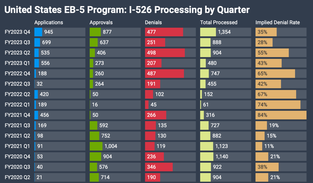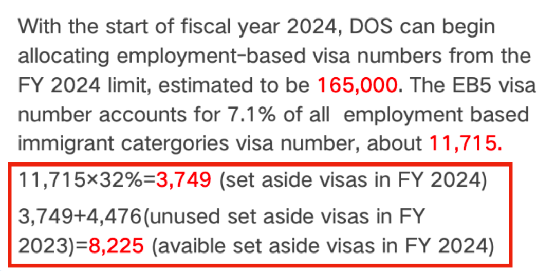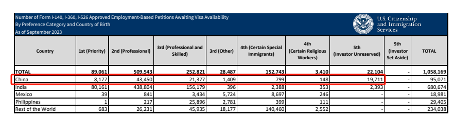 根据美国移民局公布的2023财年(2022.10.1-2023.9.30)美国移民申请和审理数据。EB-5老法的I-526在整个2023财年,共有2149组获得批准,9527组积压申请等待审理。目前中印累积共有22104组老法I-526已经获得批准并在等待签证配额排期。按照平均2.5个家庭人数来计算,已经累积超过有5.5万张签证等待发放,意味着老法EB-5中国投资人至少还需要再等待7-8年才能拿到签证名额。