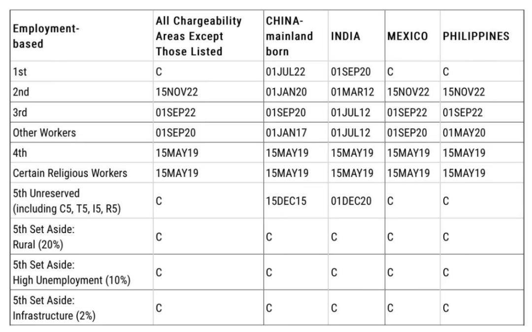 美国国务院签证办公室(DOS)每月会公告当月的排期情况,如图所示为2024年2月美国绿卡排期表A数据。按国别划分,中国投资人在旧政EB-5排期时间为2015年12月15日,也就是该日及以前递交的中国EB5申请,都可以分配到签证名额。而新政下EB-5为排期时间为C(Current),也就是无排期。