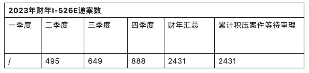 根据美国移民局公布的2023财年第四季度(2023.7.1-2023.9.30)的申请统计数据,签收案件:888件,累计积压待审理案件:2431件。与此前二、三季度递案数据相比,平均季度增速达到30+%,每月递案量有望突破300组。