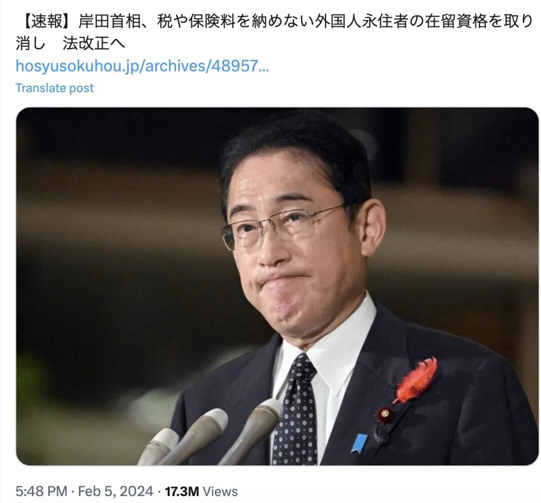 根据日本新闻报道,日本首相岸田文雄宣布:日本政府已开始考虑修改法律,规定拥有永住身份的外国人如果不缴纳税款和社会保险费,将被取消其永住身份。