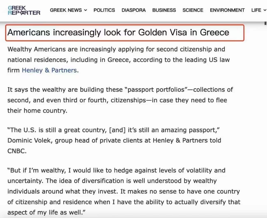 相关统计机构称,美国人选择第二公民身份的首选目的地是葡萄牙、马耳他、希腊。随着葡萄牙宣布终止购房黄金签证计划,希腊已成为美国富豪规划第二身份的首选。