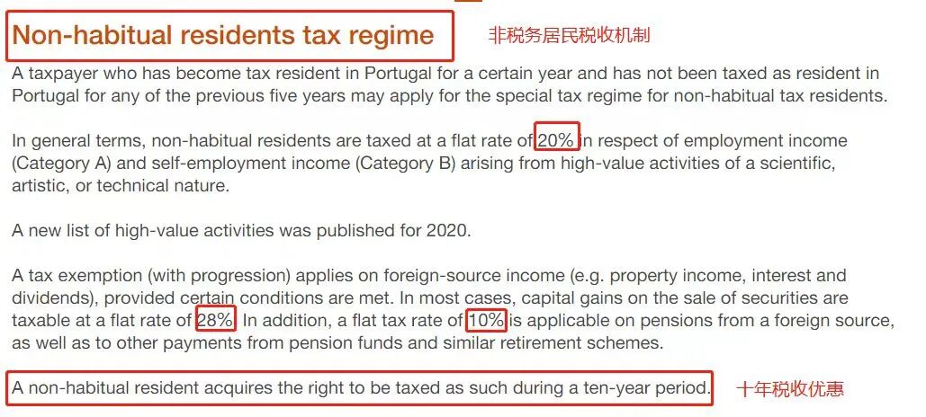 在葡萄牙,如果在财政年12个月内连续或不连续居住超过183天才会被视作税务居民,而居住少于183天则视为非税务居民(NHR)。非税务居民可以享受为期十年的特殊税收制度,本国收入来源可免税。
