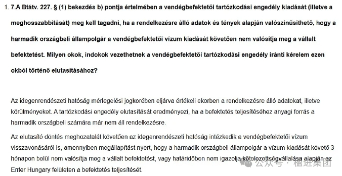 一旦决定拒绝居留许可,如果发现第三国国民在访客投资者签证签发后的三个月内未实施承诺的投资,或者未在 Enter Hungary 平台上按时证明已完成投资,移民局还将采取措施撤销访客投资者签证。
