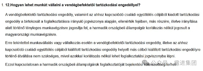 持有访客投资者居留许可及其为家庭同居目的而签发的相关居留许可的第三国国民,有权在匈牙利不受限制地工作。持证人可以根据其法律雇佣关系为他人工作或在他人的指导下工作,以换取报酬。