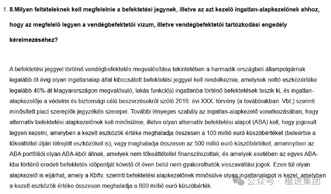 第三国国民若通过投资房地产基金获得访客投资者居留许可,必须持有该基金颁发的投资证书至少五年,其中至少40%的资金必须投资于匈牙利的住宅地产,且房地产基金的管理者必须在2016年XXX法律(简称Vbt.)规定的防御和安全采购合格市场参与者名单上。