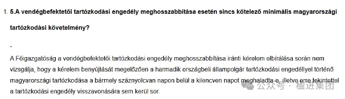 在处理访客投资者居留许可续期申请时,匈牙利移民局不会审查持有居留许可的第三国国民在申请续期前180天内是否在匈牙利停留超过90天,并且不会因这一情况而撤销居留许可。