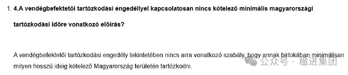 关于访客投资者居留许可,没有规定持有该许可时必须在匈牙利逗留的最低时间要求。