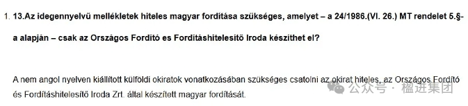 对于非英语语种的外国文件,必须附上国家翻译与认证办公室提供的匈牙利正式翻译。