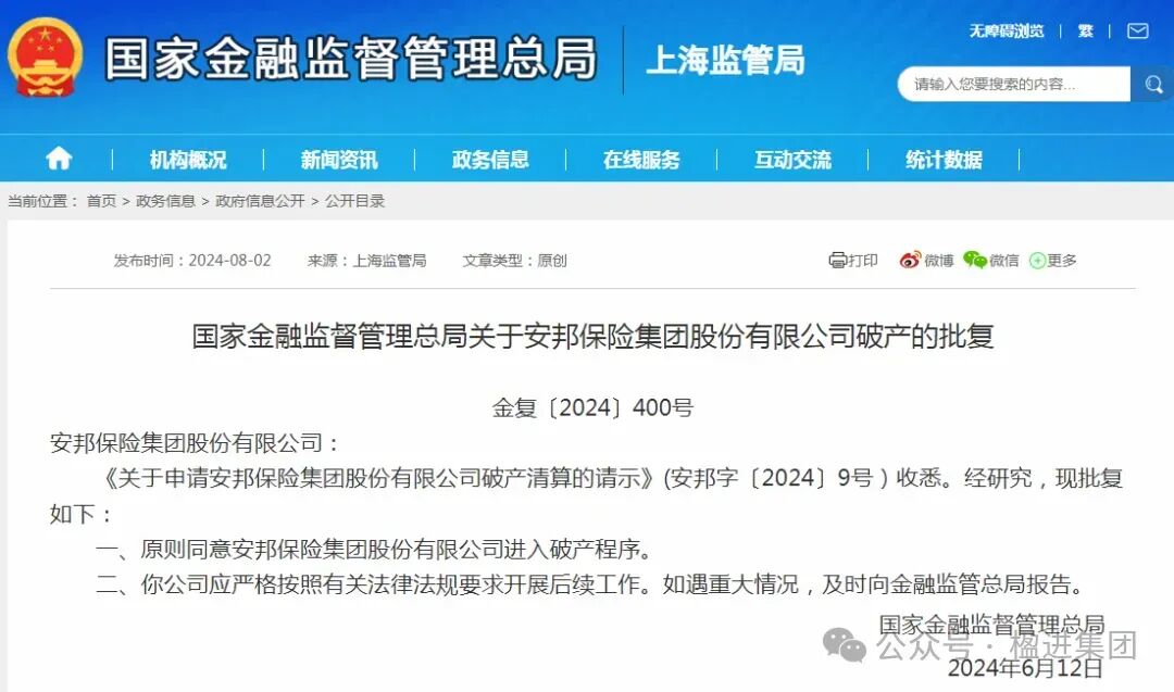 8月2日,金监总局网站公布批复,同意安邦保险集团及安邦财产保险进入破产程序,这标志着曾经资产高达2万亿元的保险巨头正式退出历史舞台。这也是继包商银行和新华信托之后,又一家破产的金融机构。