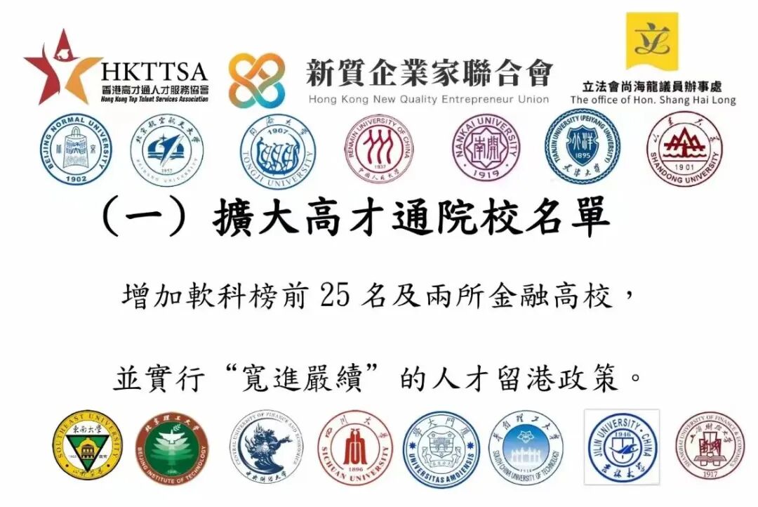 立法会议员/香港高才通人才服务协会创办人尚海龙,为推动“抢人才2.0”,并给出了6条建议。其中,包括扩充「高才通」院校名单,优化「来港人才」福利,以及「留港人才服务优先」等。
