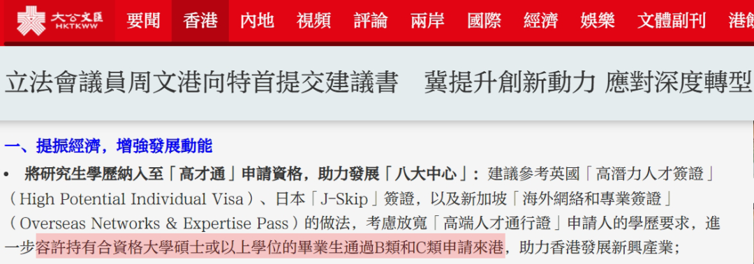 此外,在《施政报告》的提案中,亦有议员提议,符合条件的硕士及以上学历的学生,亦可申请「高才通 B/C类」来港。