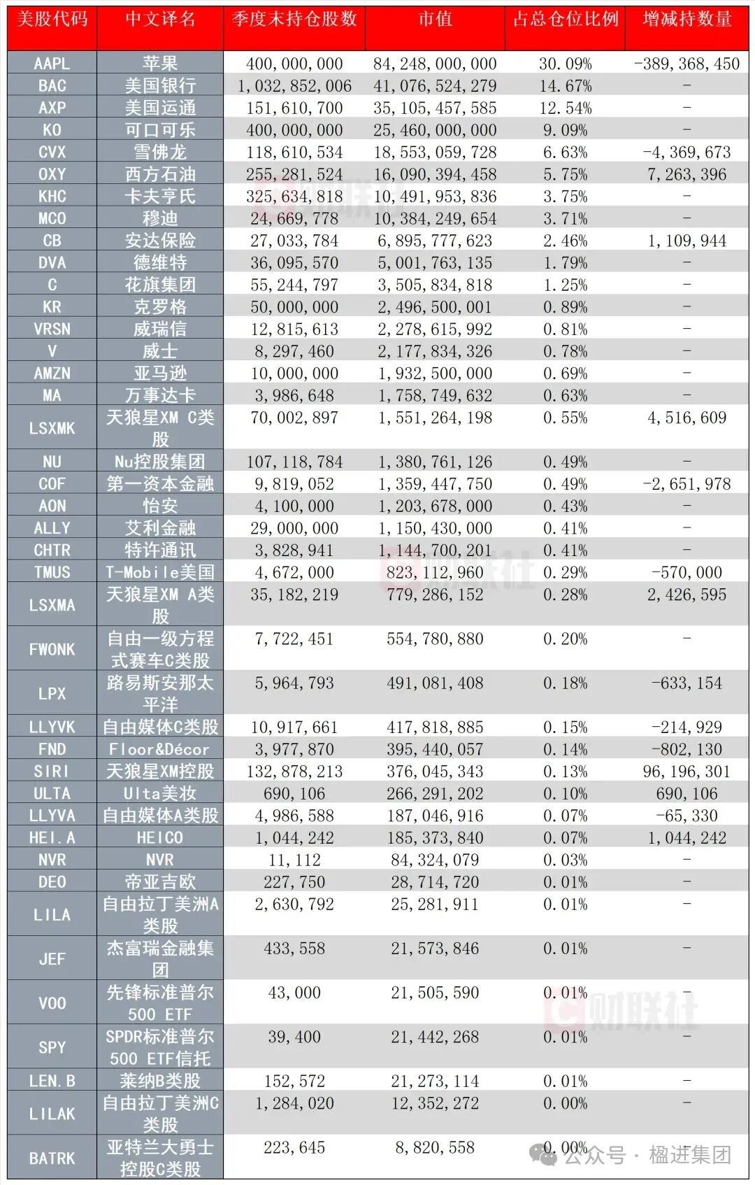 (伯克希尔二季度末持仓,图源:财联社)