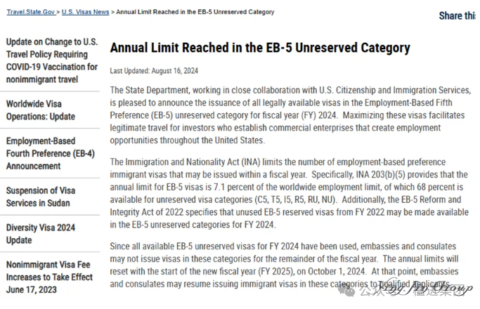 鉴于2024财年非预留EB-5签证名额已经分配完毕,美国各使馆及领事馆将在本财年剩余时间内暂停此类签证的发放工作。
