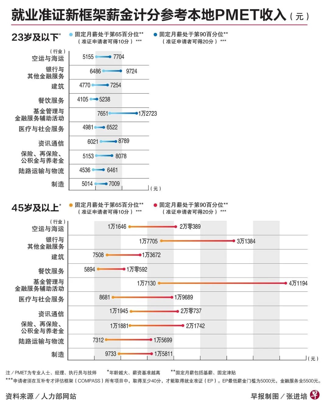 EP不设限额,首次成功申请者,可在本地工作两年。不同行业的薪资基准差距显著,且年龄越高差距越大,其中从事银行、金融、保险、资讯通信和专业服务的PMET收入更高。