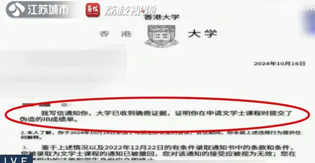 李女士愤怒不已,她认为中介机构在帮助女儿申请港大时,擅自伪造了美国高中的学历及IB成绩。