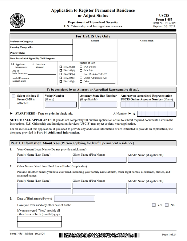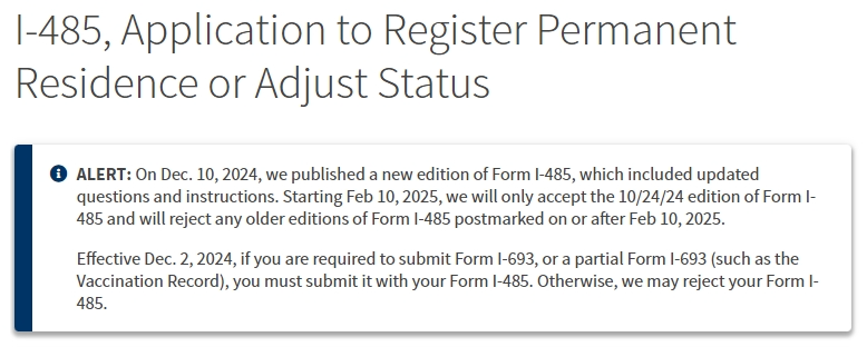 2024年12月10日,USCIS还发布了新版表格I-485注册永久居民或调整身份的申请。从2025年2月10日开始,USCIS将只接受10/24/24版本的I-485表格,并拒绝任何旧版本的I-485表格。