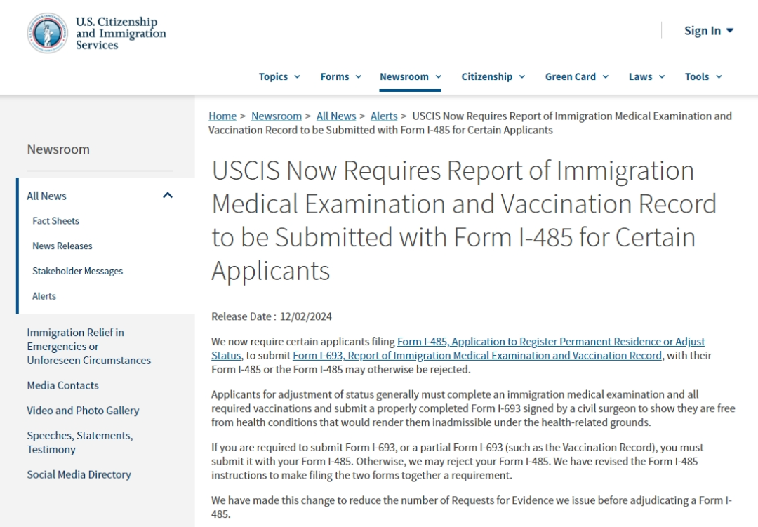 12月2日美国移民局(USCIS)发布的最新政策公告明确表示,部分提交I-485表格(注册永久居民或调整身份申请)的申请人,必须同时提交I-693表格(移民体检和疫苗接种记录)。