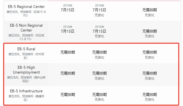 特别是中国大陆申请人密切关注的EB-5投资移民类别,传统政策下的表A排期为2016年7月15日,表B排期为2016年10月1日。新政策下的三类预留签证类别,即乡村、高失业地区及基建项目,其表A和表B目前依然显示无排期状态。