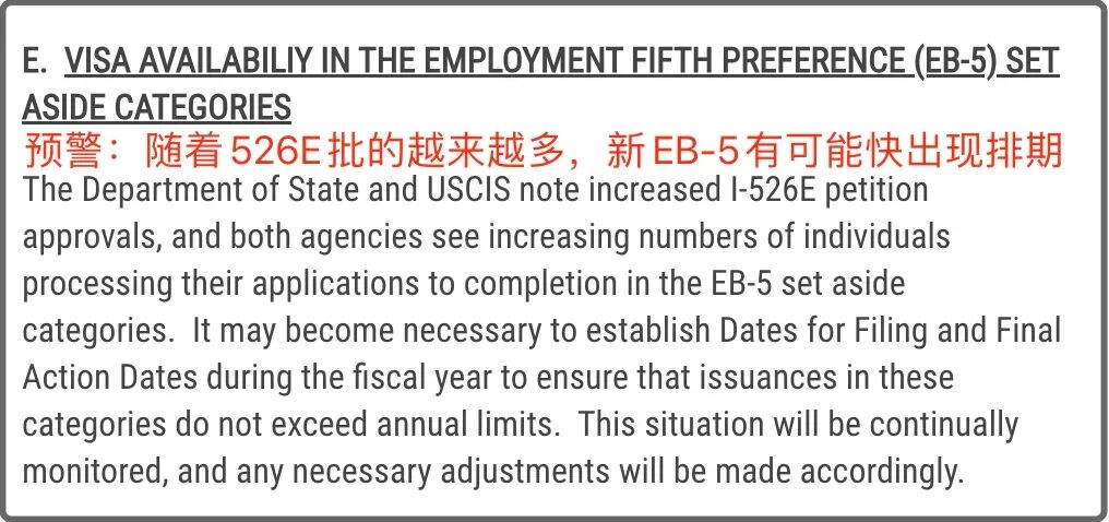 然而,在此次签证公告中首次出现了对预留签证通道排期的风险预警,据公告指出,随着I-526E申请获批数量的上升,完成整个申请流程的人数也在持续增加,EB-5预留类别的签证配额正逐渐感受到年度限额的压力。